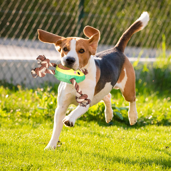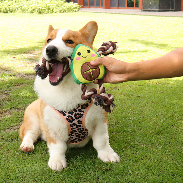 Its adorable avocado design features a smiling face, textured details, and a soft squeaky pit that adds excitement to every bite. Ideal for puppies and adult dogs alike, the breathable cotton material is gentle on teeth and gums, making it perfect for indoor play, comfort cuddles, or on-the-go fun.