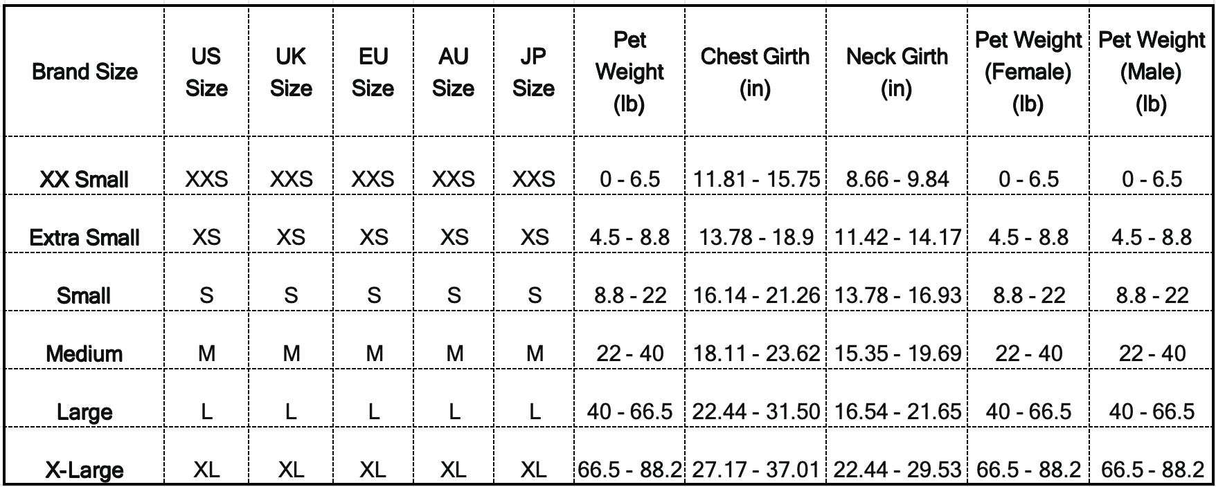 Multiple sizes from XXS-XS